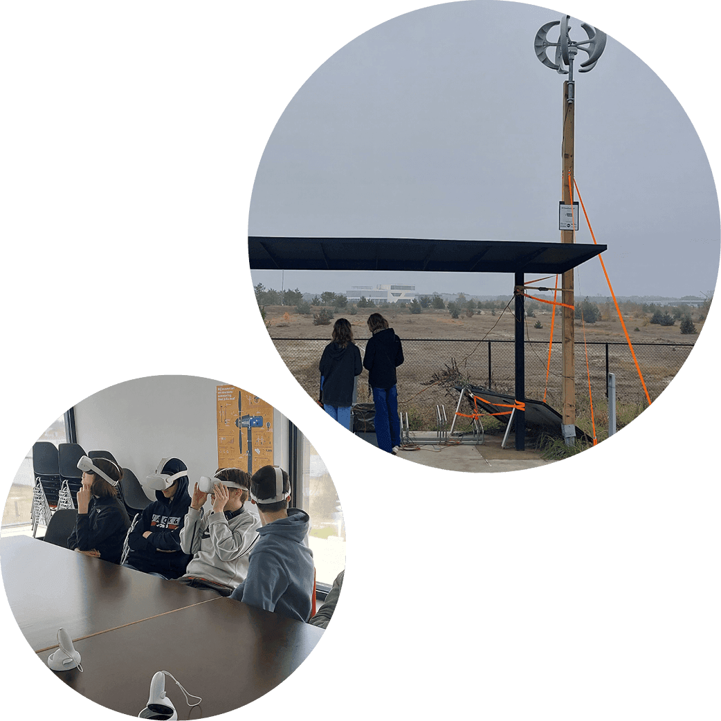 Liever geen wandeling? Je kan ook vanop je stoel een windturbine van binnenuit bezoeken. Een 3D-beleving met tot 25 synchroon aangestuurde VR-brillen in samenwerking met Luminus. Met gedetailleerde PowerPoint en een Kahootquiz.